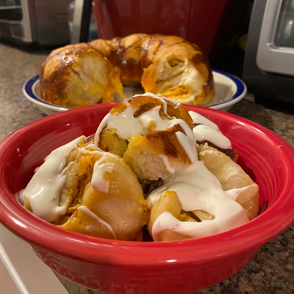 - Fold the dough over and around the buffalo chicken mixture, pinching the edges together and forming a ball. Repeat with remaining dough. (If you don’t use all the chicken mixture, save it in a bowl and refrigerate to use as dip).
