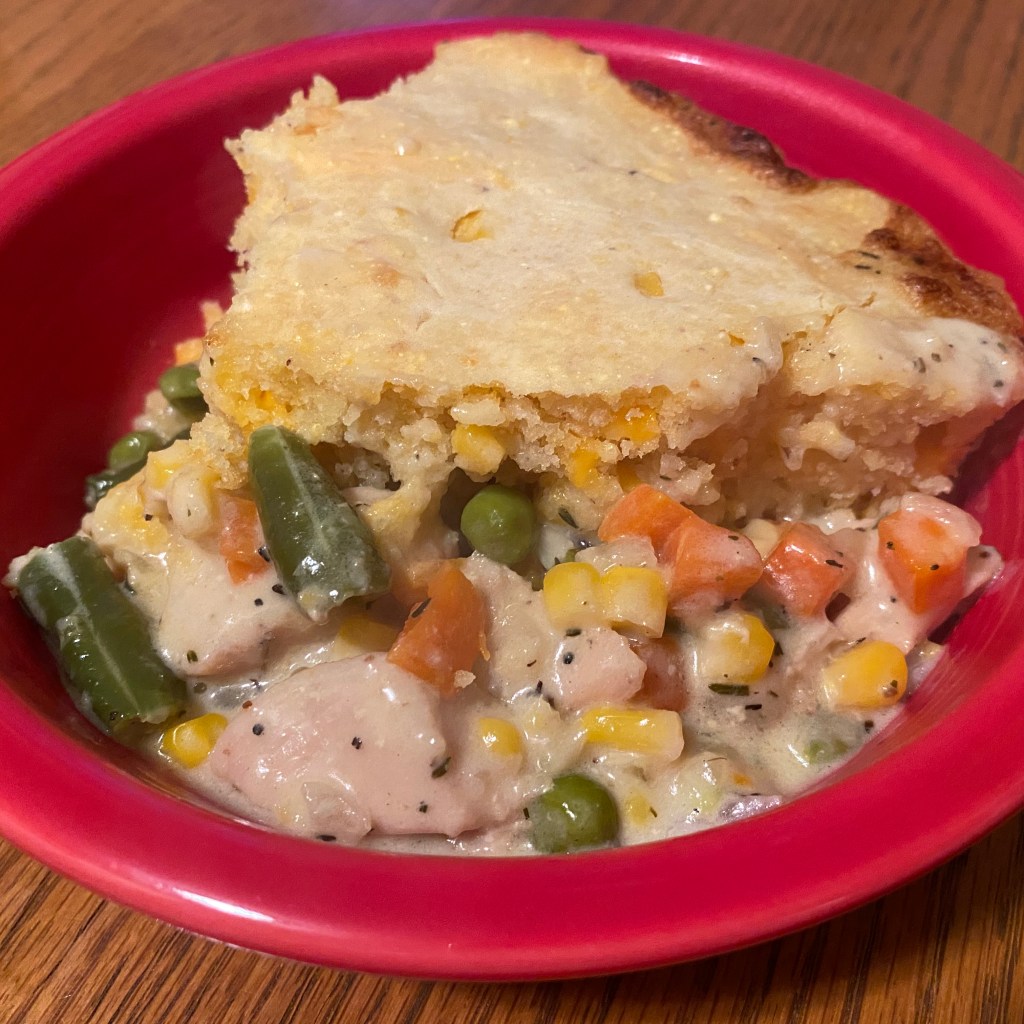 - Spoon the cornbread mixture on top of the chicken filling and spread it to the edges of the pan.