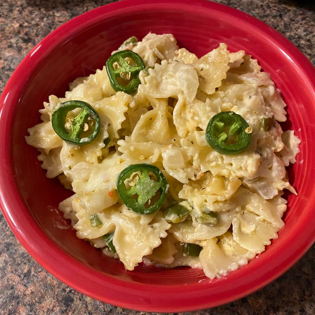 - Remove the sauce from the heat and add in 1/2 cup of pepper jack and 1/2 cup of cheddar cheeses, and stir until melted.