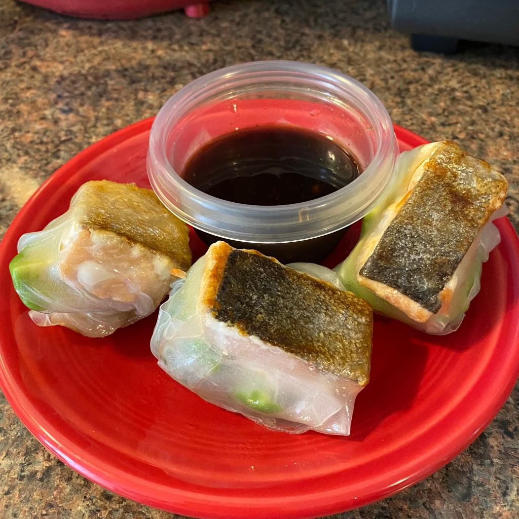 - Place the firecracker salmon rolls into the pan and cook until crisp.