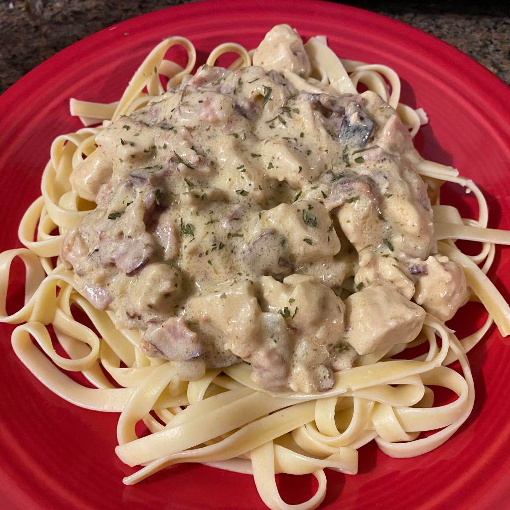 - Pour the bacon, onion and cream mixture into skillet with the chicken and stir until combined.