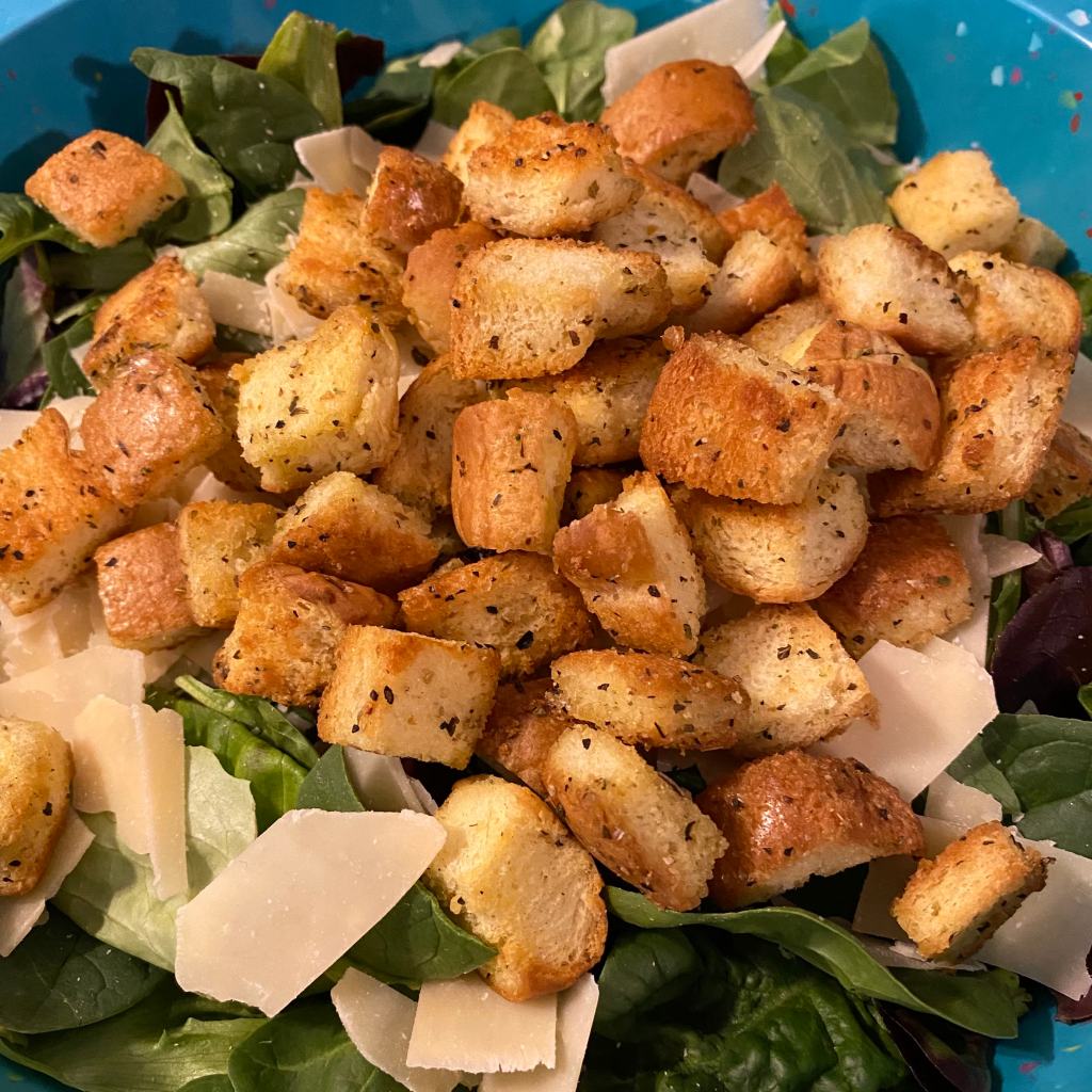 - Sprinkle with all of the seasonings toss until bread pieces are evenly coated, drizzling with the remaining oil while tossing.