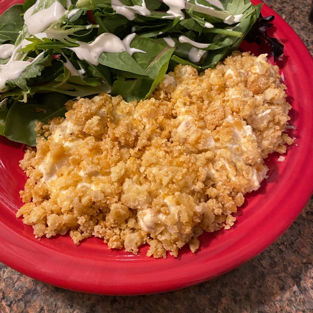 - Bake, uncovered, for about 30-35 minutes, or until the casserole is bubbly and the cracker topping is golden brown.