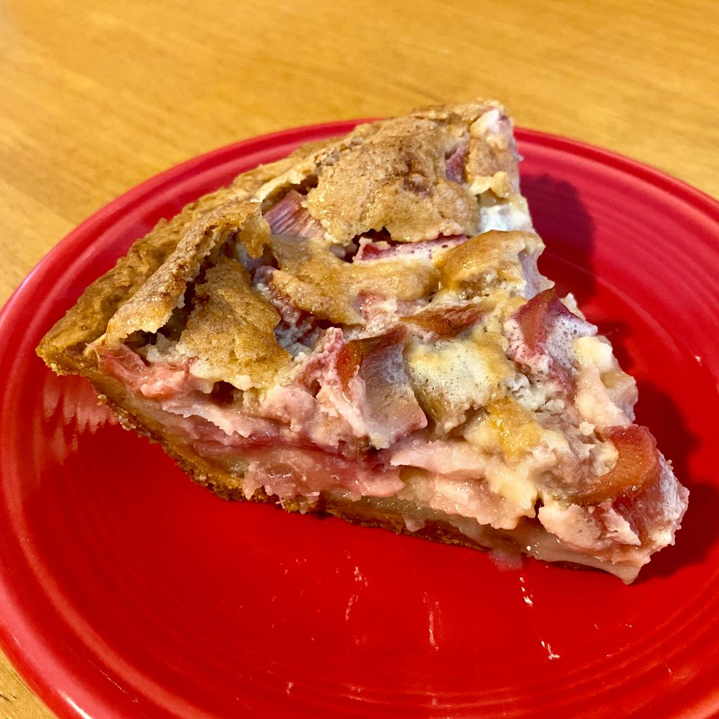- Scatter the rhubarb evenly on top, discarding any liquid at the bottom of the bowl.