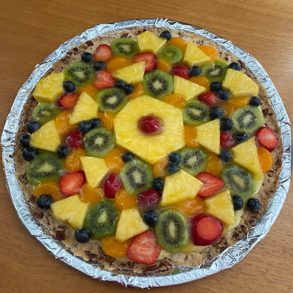 - While waiting for the glaze to cool, arrange the fruit on top of cooled cream cheese layer.