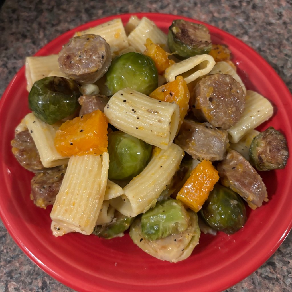 - Toss the pasta, roasted vegetables, sausage, and garlic butter sauce together; season with salt and pepper.
