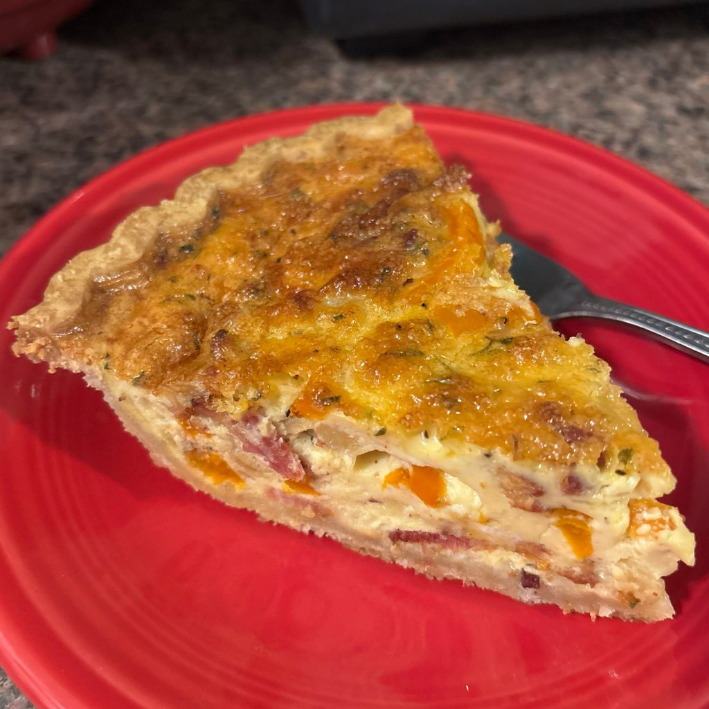 - Bake the quiche in the preheated oven until the center is set and the top is lightly browned, about 45 minutes (cover the crust edges with foil for the last 5-10 minutes or so if getting too done).