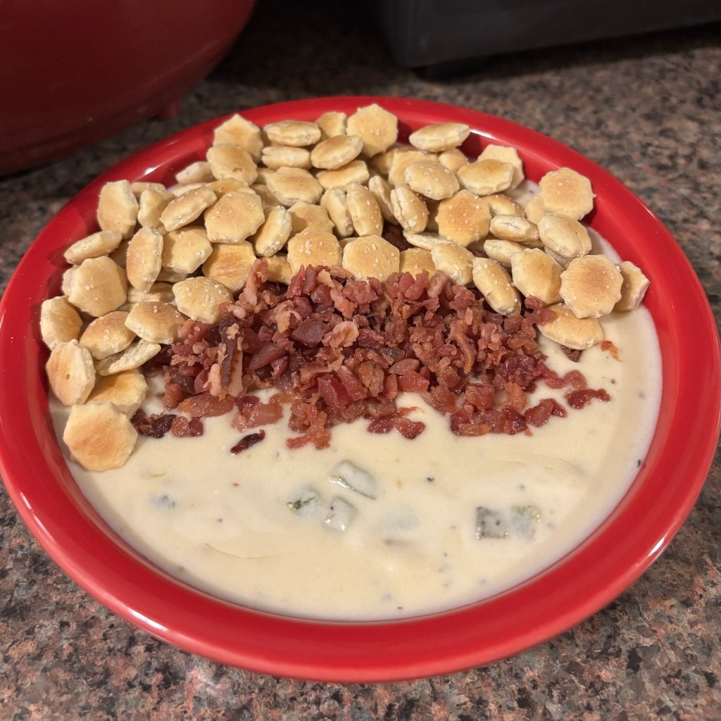 - Serve hot, sprinkled with bacon bits (if desired) and oyster crackers.