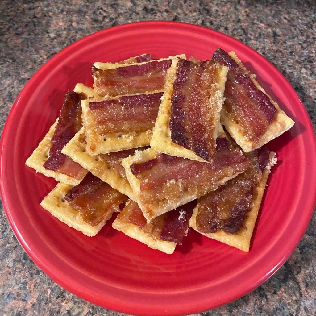 Bake in the preheated oven for about 1 hour or until bacon is crisp and the crackers are browned (increase the baking temperature to 275 degrees after the first hour if desired).